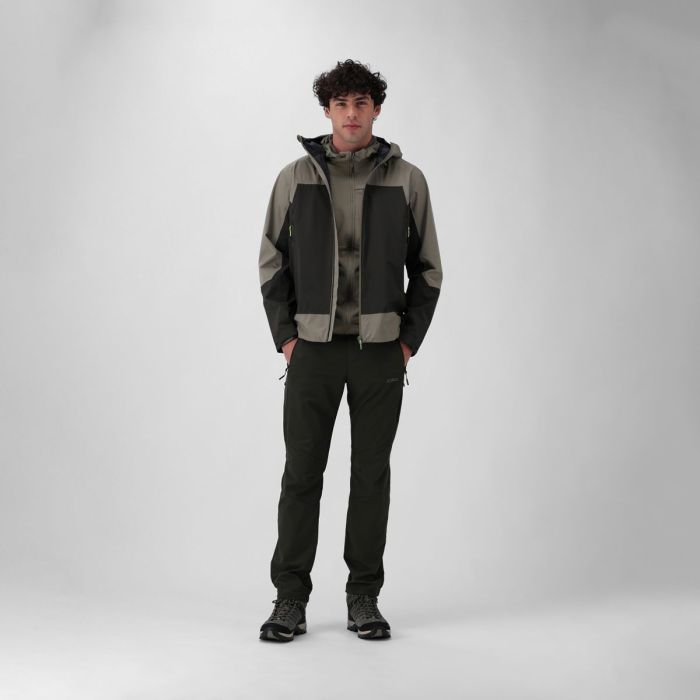Guscio tecnico a 3 strati da uomo progettato per offrire protezione totale in condizioni climatiche estreme. Realizzato in tessuto 3 strati con membrana (100% PL, 110 g/m²), garantisce impermeabilità WP 20.000, traspirabilità MVP 20.000 e water repellent, mentre le cuciture totalmente nastrate e le zip waterproof assicurano protezione completa da pioggia e vento. Il capo presenta un cappuccio fisso con visiera sagomata, regolazioni laterali e posteriori del volume, e un collo alto frontale per la massima protezione antivento. Il design funzionale include due ampie tasche frontali con zip, una secret pocket interna per oggetti di valore, e aerazioni sotto-manica con zip coperta e inserto in mesh traspirante per ottimizzare il comfort termico. I dettagli tecnici comprendono polsini regolabili con alamaro e velcro e fondo giacca regolabile con coulisse ai lati, mentre il regular fit garantisce libertà di movimento e possibilità di stratificazione. Un guscio versatile e altamente performante, ideale per attività outdoor intense, escursioni e sport in montagna in ogni condizione atmosferica.